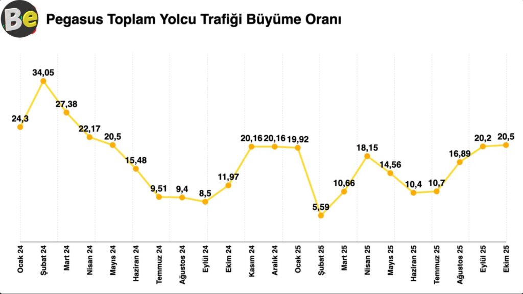 Pegasus Hava Yolları ise ekim ayında toplam yolcu sayısını yıllık bazda %21 artırarak 4,06 milyon kişiye çıkardı. İç hat yolcu sayısı %12, dış hat yolcu sayısı %26 artarken, toplam uçuş sayısı %19 yükseldi. İç hat uçuşlar %9, dış hat uçuşlar ise %24 oranında arttı. Doluluk oranı %88,7’ye ulaşırken, iç hatlarda %91,2, dış hatlarda %87,5 oldu. Arz edilen koltuk kilometre (ASK) büyümesi iç hatlarda %21, dış hatlarda %26, toplamda %25 olarak gerçekleşti.