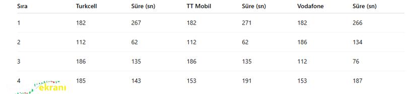 Yılın ikinci çeyreğinde, 3 operatörden en sık yapılan 5 kısa numara ve ortalama çağrı süreleri (saniye) ise şöyle: