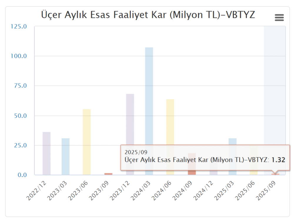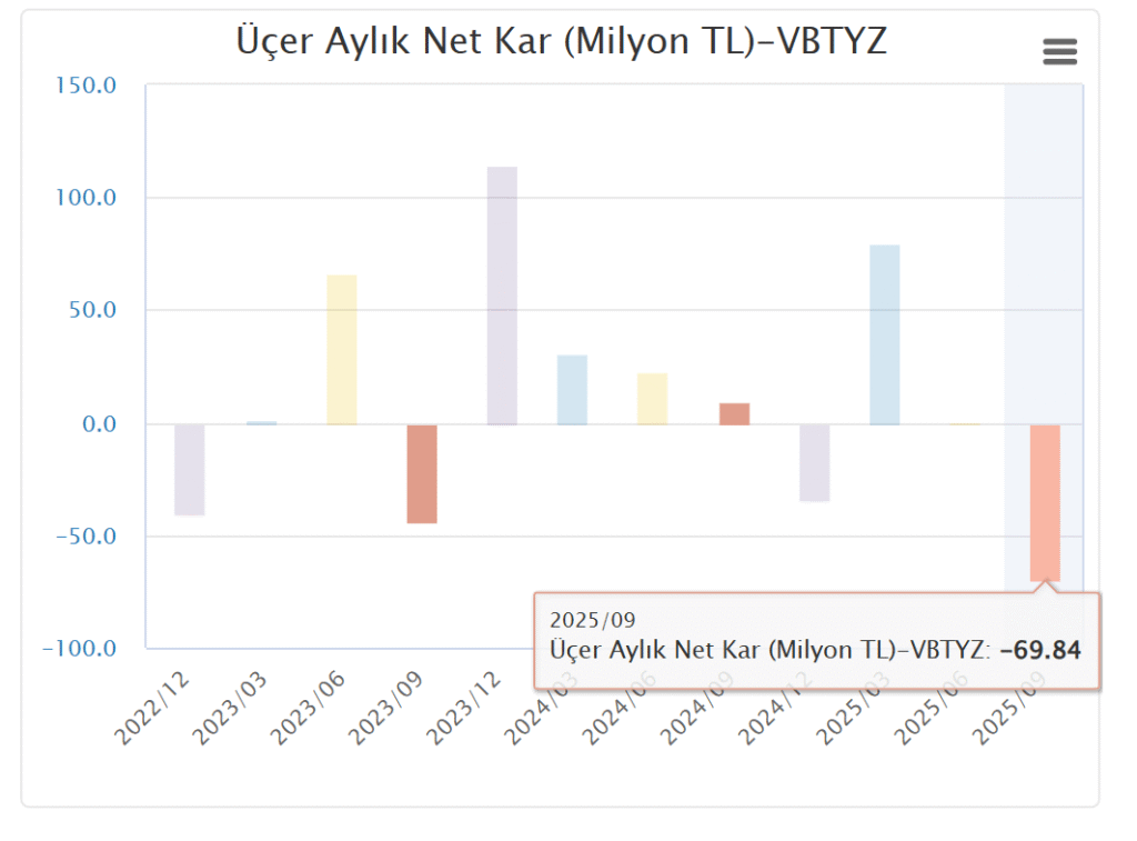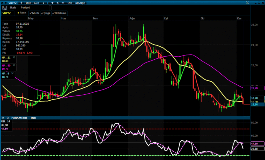 Teknik tarafta ise VBTYZ hissesi, bilanço açıklaması öncesinde 18,16 TL seviyesinden kapanış yaptı. Grafik görünümünde kısa vadeli hareketli ortalamalar aşağı yönlü eğilimini sürdürürken, RSI göstergesi 39,88 seviyesinde bulunuyor. Bu seviye, hisse için aşırı satım bölgesine yakın bir teknik görünümün oluştuğuna işaret ediyor.