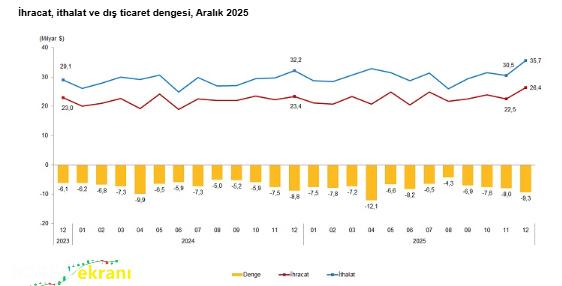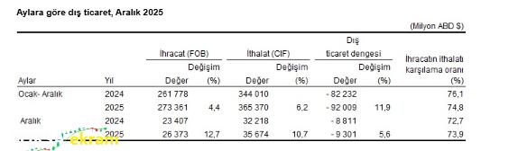 Aralık ayında dış ticaret açığı bir önceki yılın aynı ayına göre yüzde 5,6 artarak 8 milyar 811 milyon dolardan, 9 milyar 301 milyon dolara yükseldi. İhracatın ithalatı karşılama oranı 2024 Aralık ayında yüzde 72,7 iken, 2025 Aralık ayında yüzde 73,9’a yükseldi.