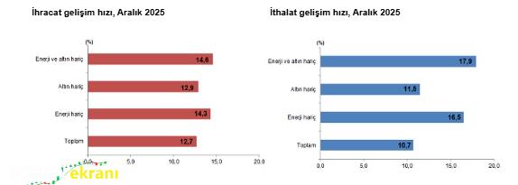Enerji ürünleri ve parasal olmayan altın hariç ihracat, 2025 Aralık ayında yüzde 14,6 artarak 21 milyar 706 milyon dolardan, 24 milyar 876 milyon dolara yükseldi. Aralık ayında enerji ürünleri ve parasal olmayan altın hariç ithalat yüzde 17,9 artarak 23 milyar 413 milyon dolardan, 27 milyar 614 milyon dolara yükseldi. Enerji ürünleri ve parasal olmayan altın hariç dış ticaret açığı Aralık ayında 2 milyar 738 milyon dolar olarak gerçekleşti. Dış ticaret hacmi yüzde 16,3 artarak 52 milyar 490 milyon dolar olarak gerçekleşti. Söz konusu ayda enerji ve altın hariç ihracatın ithalatı karşılama oranı yüzde 90,1 oldu.