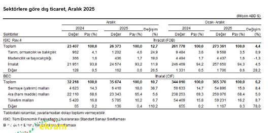 2025 yılı Aralık ayına ait dış ticaret istatistikleri açıklandı. Türkiye İstatistik Kurumu (TÜİK) ile Ticaret Bakanlığı iş birliğiyle genel ticaret sistemi kapsamında üretilen geçici dış ticaret verilerine göre; ihracat 2025 yılı Aralık ayında, bir önceki yılın aynı ayına göre yüzde 12,7 artarak 26 milyar 373 milyon dolar, ithalat ise yüzde 10,7 artarak 35 milyar 674 milyon dolar olarak gerçekleşti. Ocak-Aralık döneminde ihracat yüzde 4,4, ithalat yüzde 6,2 arttı.