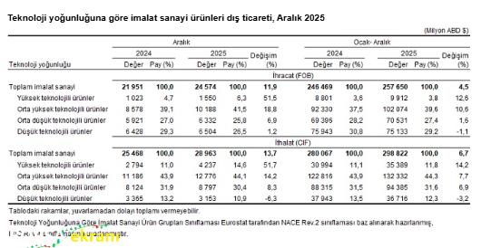 Teknoloji yoğunluğuna göre dış ticaret verileri, ISIC Rev.4 sınıflaması içinde yer alan imalat sanayi ürünlerini kapsıyor. Aralık ayında ISIC Rev.4’e göre imalat sanayi ürünlerinin toplam ihracattaki payı yüzde 93,2 oldu. Yüksek teknoloji ürünlerinin imalat sanayi ürünleri ihracatı içindeki payı yüzde 6,3 olarak açıklandı.nbsp;Ocak-Aralık döneminde ISIC Rev.4’e göre imalat sanayi ürünlerinin toplam ihracattaki payı yüzde 94,3 oldu. Ocak-Aralık döneminde yüksek teknoloji ürünlerinin imalat sanayi ürünleri ihracatı içindeki payı yüzde 3,8 olarak açıklandı. Aralık ayında imalat sanayi ürünlerinin toplam ithalattaki payı yüzde 81,2 oldu. Yüksek teknoloji ürünlerinin imalat sanayi ürünleri ithalatı içindeki payı yüzde 14,6 olurken, Ocak-Aralık döneminde imalat sanayi ürünlerinin toplam ithalattaki payı yüzde 81,8 olarak açıklandı.