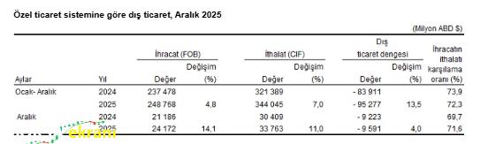 İhracat 2025 yılı Ocak-Aralık döneminde 248 milyar 768 milyon dolar oldu Özel ticaret sistemine göre ihracat, 2025 yılı Ocak-Aralık döneminde, bir önceki yılın aynı dönemine göre yüzde 4,8 artarak 248 milyar 768 milyon dolar, ithalat yüzde 7 artarak 344 milyar 45 milyon dolar olarak gerçekleşti. Ocak-Aralık döneminde dış ticaret açığı yüzde 13,5 artarak 83 milyar 911 milyon dolardan, 95 milyar 277 milyon dolara yükseldi. İhracatın ithalatı karşılama oranı 2024 Ocak-Aralık döneminde yüzde 73,9 iken, 2025 yılının aynı döneminde yüzde 72,3’e geriledi.