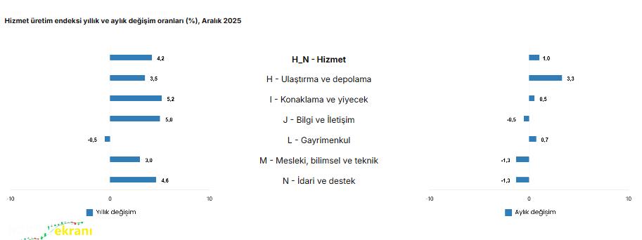 Türkiye İstatistik Kurumu (TÜİK) 2025 yılı Aralık ayına ilişkin hizmet üretim endeksi verilerini açıkladı. Buna göre, hizmet üretim endeksi (2021=100) 2025 yılı Aralık ayında bir önceki yılın aynı ayına göre yüzde 4,2 arttı.nbsp;Aynı ayda ulaştırma ve depolama hizmetleri yüzde 3,5, konaklama ve yiyecek hizmetleri yüzde 5,2, bilgi ve iletişim hizmetleri ise yüzde 5 oranında artış gösterdi. Ayrıca, aynı dönemde gayrimenkul hizmetleri yüzde 0,5 azalırken, mesleki, bilimsel ve teknik hizmetler yüzde 3, idari ve destek hizmetleri ise yüzde 4,6 arttı.