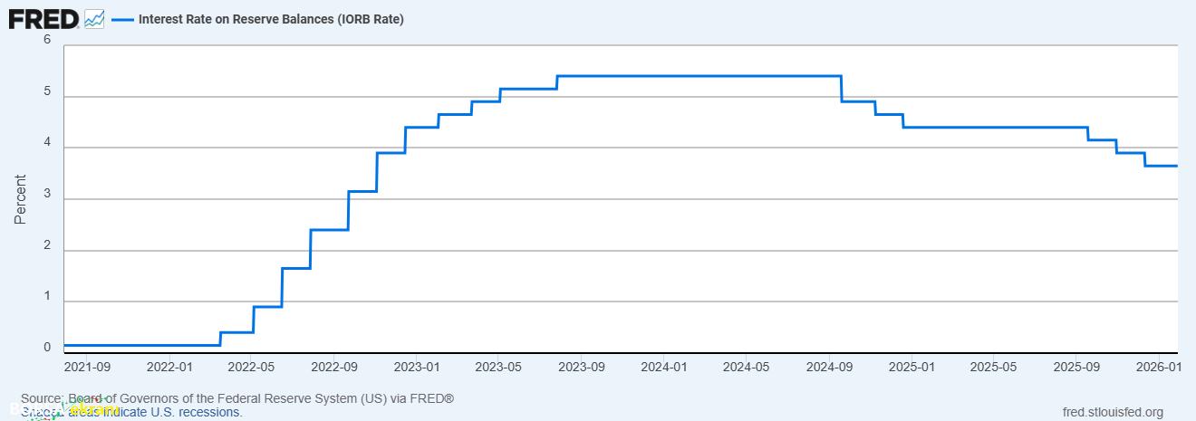 Fed, 2025 yılında toplam 75 baz puanlık faiz indirimiyle aşırı kısıtlayıcı duruştan çıkmıştır. Ancak bu adım, “gevşek para” rejimine geçildiği anlamına gelmemektedir. Interest Rate on Reserve Balances (IORB) Fed’in “faizden çok likidite” stratejisinin omurgası Açıklama: