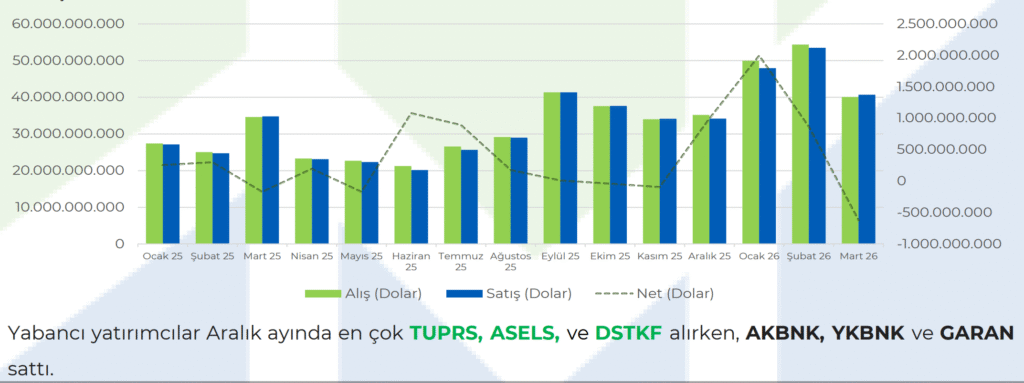 Mart 2026’da yabancı yatırımcıların toplam işlem hacmi 80,8 milyar dolara ulaşırken, ay sonunda 623,3 milyon dolarlık net alım gerçekleşti. Aralık ayında ise en çok TUPRS, ASELS ve DSTKF hisseleri tercih edildi.
