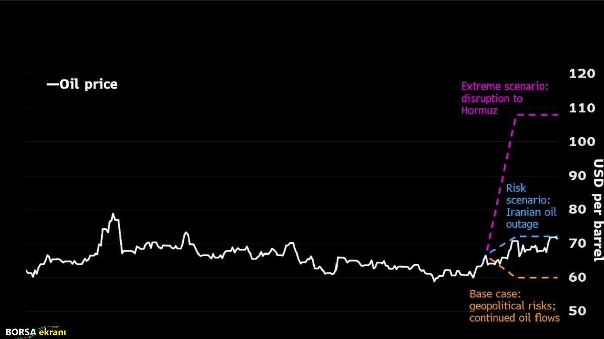 Şu an dünya ekonomisinin kalbi Hürmüz Boğazı’nda atıyor. Resmi kapama Pazar gecesi geldi. Dünya petrol ticaretinin beşte birinin geçtiği bu dar geçit, küresel enerji sisteminin şah damarıdır. Bu damar sıkıştığında, Türkiye gibi enerji ithalatçısı ülkeler için “ekonomik türbülans” bekleyebiliriz. Bloomberg’e göre piyasa projeksiyonları, Hürmüz Boğazı’nda yaşanacak bir aksamanın petrol fiyatlarını baz senaryodaki 60 dolar seviyesinden, dikey bir tırmanışla 110 doların üzerine fırlatabileceğini gösteriyor. Ama 110 doların olması şimdilik olası senaryo değil. Kapanma sonrasındaki ilk saatlerde petrol fiyatları resmen 70 dolar/varil seviyesinin altına düştü, gün içinde yaklaşık %3,5 artış gösterdi. Beklenen artışın henüz gerçekleşmemesi petrolün gürültüyü görmezden geldiğini gösteriyor. Ama şimdilik…  Aşağıdaki grafik senaryoları daha detaylı anlatıyor. X’ten @kayabo19’un paylaşımından bir kesit.