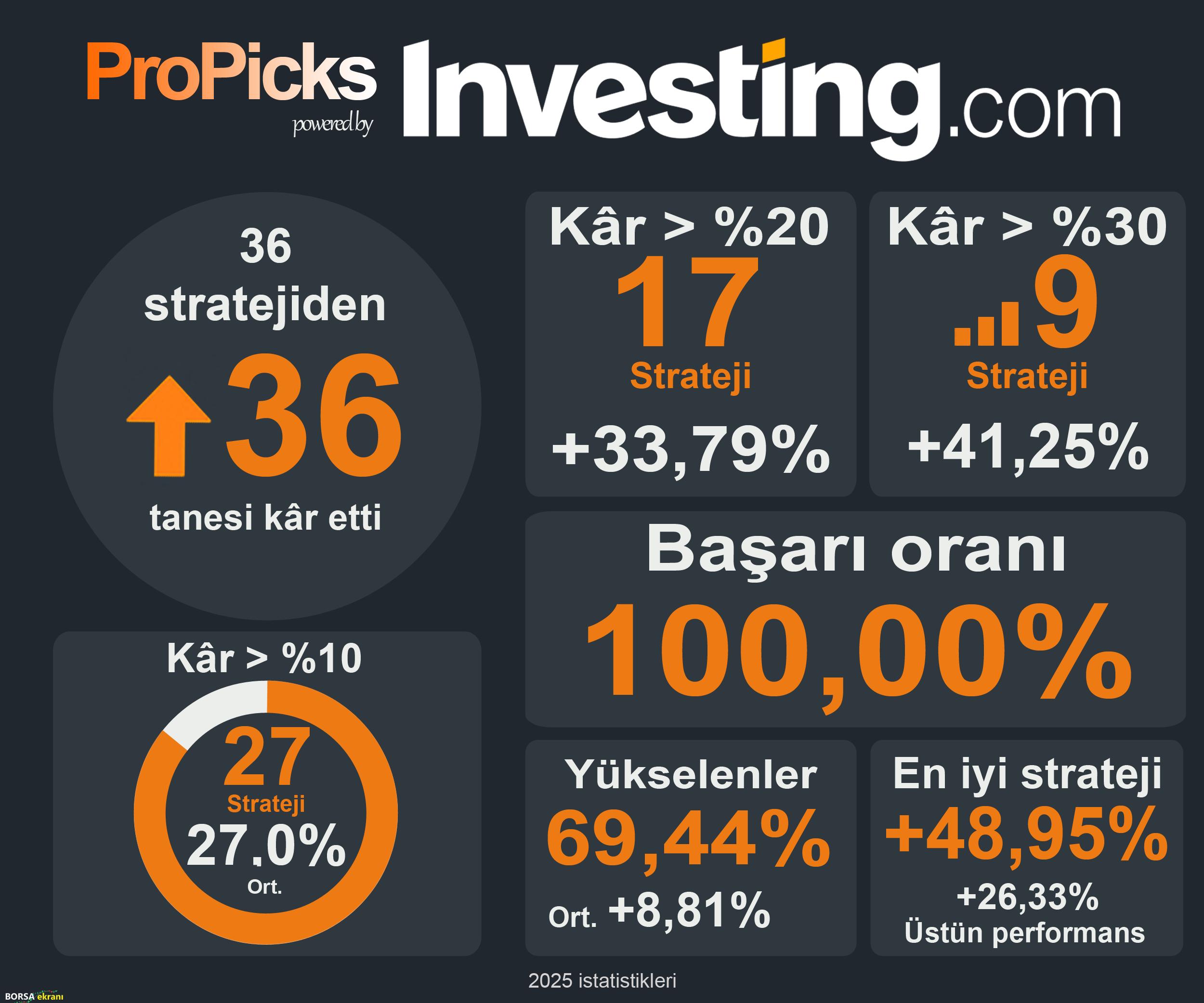 Sonuç olarak, ABD ProPicks hisselerinden bazıları kazanç elde etmeyi başardı ve hatta gösterge endekslerini geride bıraktı. Orta Ölçekli Mucizeler, Ekim ayında +%0,25’lik bir getiri kaydederken, S&P Midcap 400 %-1,55’lik bir kayıp yaşadı. Negatif tarafta ise bu ay %1,66 oranında düşen Değer Kasaları yer alıyor. Yine de S&P 500 Saf Değer aynı dönemde %2,63 değer kaybettiği için piyasayı geride bıraktılar. Ancak yapay zeka sadece ABD’deki bu olumsuz koşullar altında değil, aynı zamanda Alman piyasasında da performans gösteriyor. Almanya Sanayi Şampiyonları aylık %1,72’lik bir kazanç kaydederken, DAX sadece %1,14 oranında yükseldi. Dahil edilen 15 hisse senedinden 10’u pozitif bölgede ve Bilfinger (+%10,55) ile bir hisse senedi bile %10’dan fazla yükseldi. Henüz Üye Değil misiniz? Şimdi InvestingPro Abonesi Olmanın Tam Zamanı Yıllık bazda, ProPicks’in 2025’teki sonuçları şöyle: