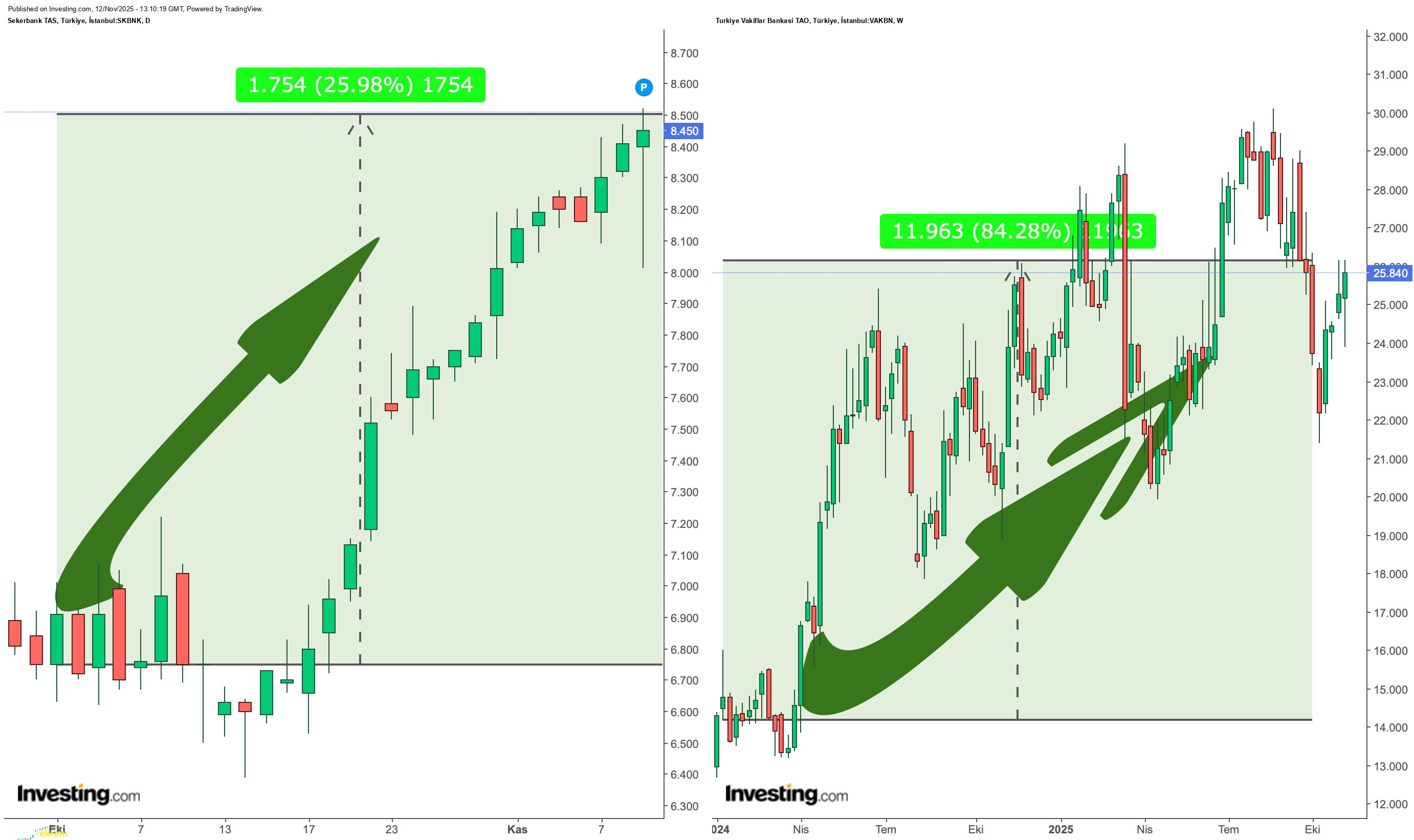 Şekerbank hissesi, Ekim ayında stratejiye 6,91 TL fiyat seviyesinden dahil edildi. Yapay zekâ destekli analizler, bu bölgeyi hissenin yükseliş trendine başladığı alan olarak işaret etmişti. Sadece birkaç hafta içinde SKBNK %25’i bulan getiri sağladı. Vakıfbank (VAKBN) ise Şubat 2024’te portföye eklendi. O tarihten bu yana hissenin yükseliş trendi hız kesmeden devam ediyor ve şu anda %80’in üzerinde toplam getiri sağlamış durumda. Aynı dönemde BIST 100 %22, bankacılık endeksi %50 yükselirken, VAKBN’in bu performansı InvestingPro stratejisinin uzun vadeli başarı potansiyelini gösteriyor.