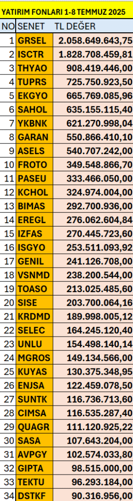 - Bu tablo Yatırım Fonlarının 01-08 Temmuz 2025 tarihinde haftalık bazda aldığı hisselerin günlük fiyatları ile çarpılması sonucu oluşturulmuştur.
