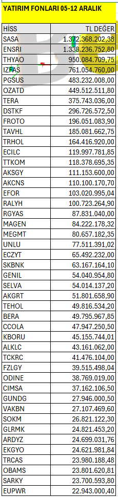Yatırım Fonları’ın haftalık bazda Borsa İstanbul’da en fazla yatırım yaptığı hisselerin listesi. Listeyi PDF formatında indirip inceleyebilirsiniz.