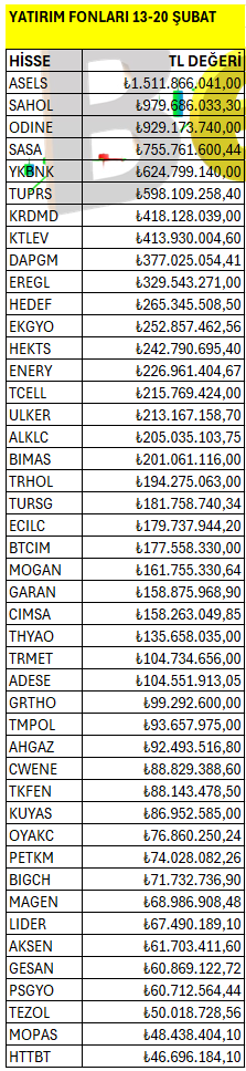 Yatırım Fonları’ın haftalık bazda Borsa İstanbul’da en fazla yatırım yaptığı hisselerin listesi. Listeyi PDF formatında indirip inceleyebilirsiniz.