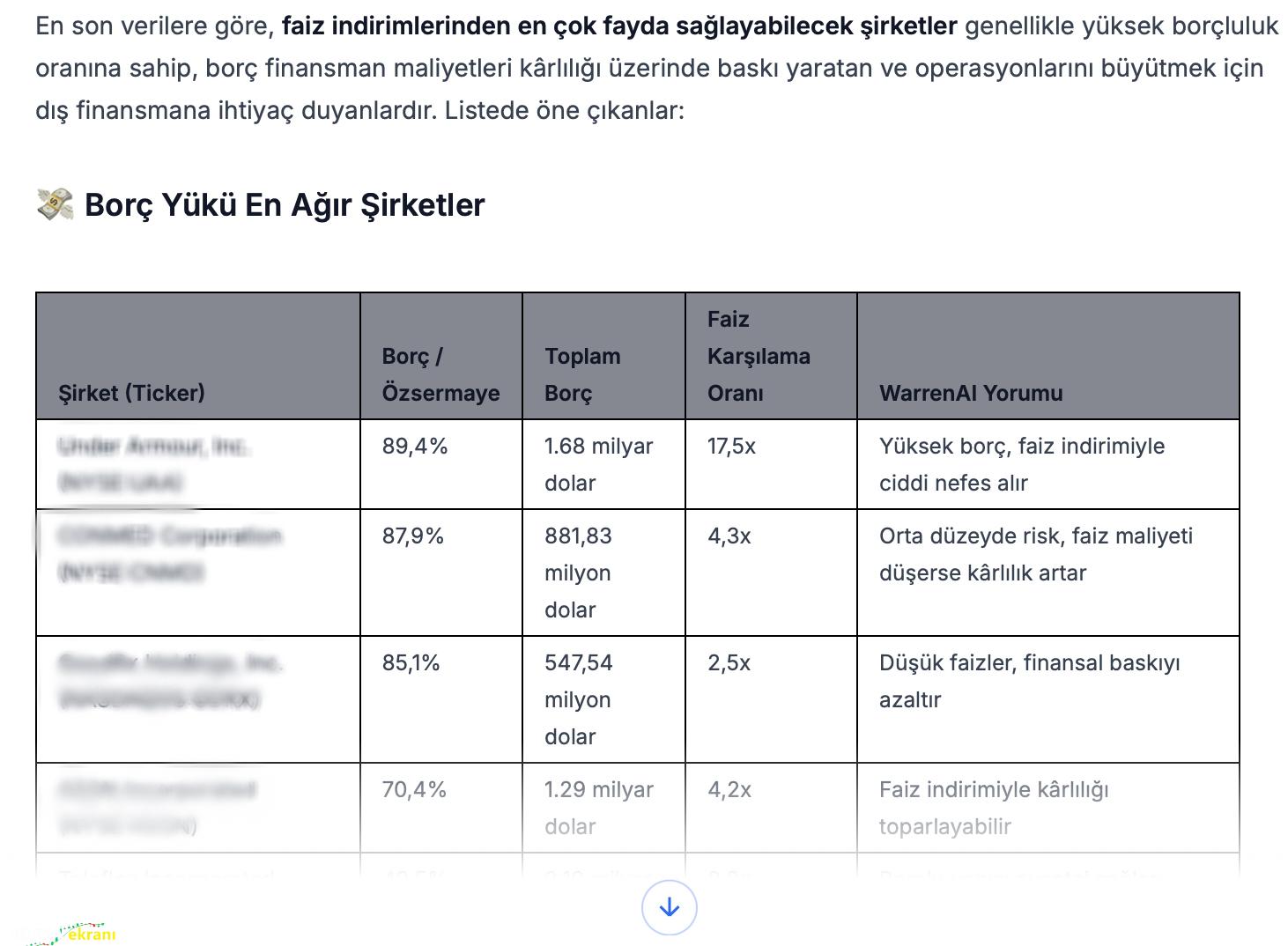 Bu soruya WarrenAI; borçluluk oranı yüksek, faiz ödemeleri büyük ve dış finansmana bağımlı şirketleri analiz ederek net yanıt verir.