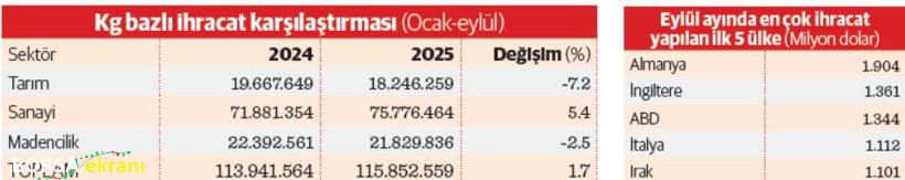 Sanayi ve Teknoloji Bakanı Mehmet Fatih Kacır, eylül ayında ihracatın geçen yılın aynı ayına göre yüzde 3 artış göstererek 22.6 milyar dolara ulaştığını bildirdi. Kacır, “Sanayicimiz, katma değerli üretim yolculuğunu sürdürüyor. Yatırım, istihdam, üretim ve ihracat rotasında güçlü yürüyüşümüz devam edecek. Türkiye’nin emeği, alın teri ve vizyonu, dünyada daha da güçlü karşılık bulacak” dedi.