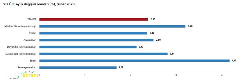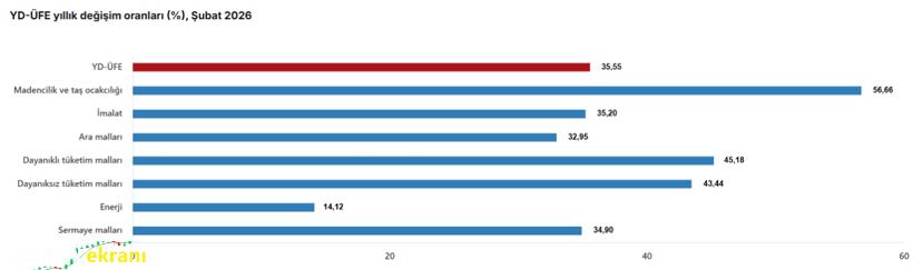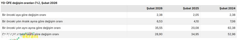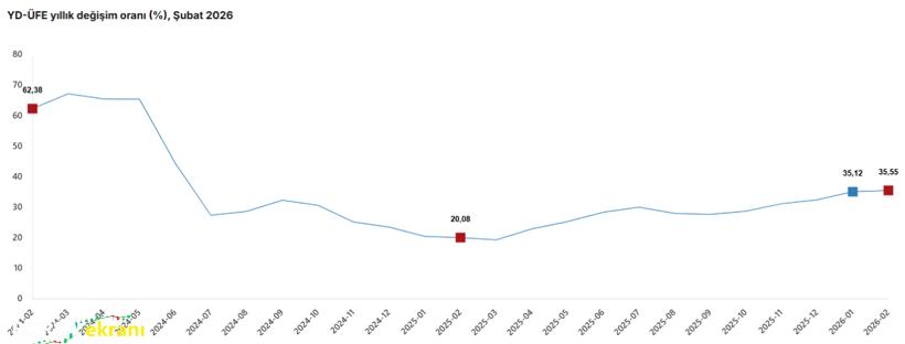 Türkiye İstatistik Kurumu (TÜİK) tarafından açıklanan verilere göre, Yurt Dışı Üretici Fiyat Endeksi (YD-ÜFE) 2026 yılı Şubat ayında bir önceki aya göre yüzde 2,38 arttı. Endeks, yılın başına göre yüzde 6,53, geçen yılın aynı ayına göre ise yüzde 35,55 yükseldi. On iki aylık ortalamalara göre artış ise yüzde 28,90 olarak kaydedildi.