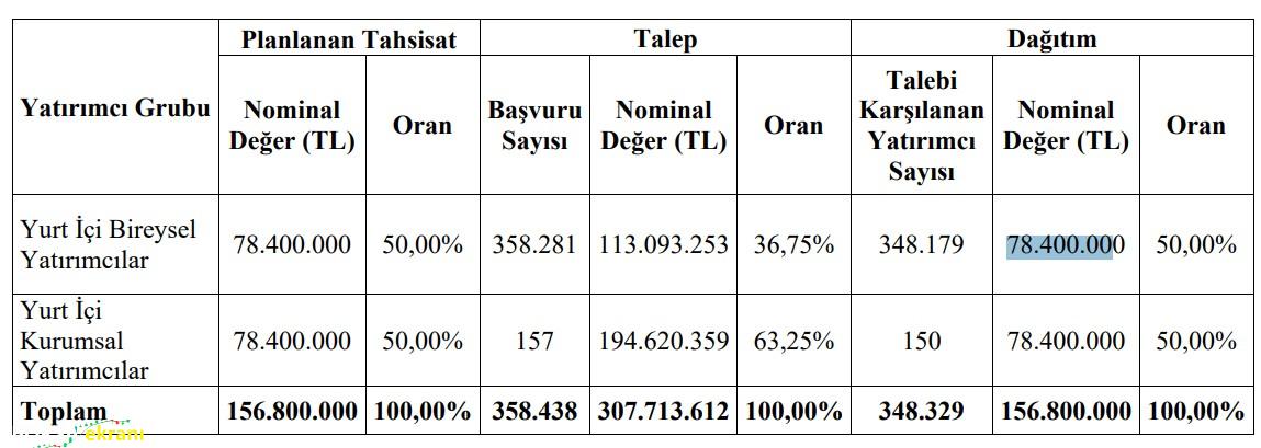 Halka arz sonuçlarına ilişkin yapılan açıklama şöyle:Zeray Gayrimenkul Yatırım Ortaklığı A.Ş.’nin (“Zeray GYO”) paylarının halka arzı 10-11-12 Aralık 2025 tarihleri arasında “Sabit Fiyatla Talep Toplama” yöntemi ile gerçekleştirilmiştir. Halka arzda; Zeray GYO sermayesinin 510.000.000 TL’den 626.000.000-TL’ye çıkarılması nedeniyle ihraç edilen 116.000.000 TL nominal değerli 116.000.000 adet pay ve mevcut ortak Zekeriya Zeray’a ait 40.800.000 TL nominal değerli 40.800.000 adet pay olmak üzere toplam 156.800.000 adet pay 13,00 TL’den satışa sunulmuş ve söz konusu payların tamamı satılarak dağıtımı gerçekleştirilmiştir. Buna göre halka arz büyüklüğü 2.038.400.000, -TL olarak gerçekleşmiştir. Halka arzda, toplam 156.800.000 TL nominal değerli paylar için planlanan satış tutarının 1,96 katı talep gelmiştir. Halka arzda; Yurt İçi Bireysel Yatırımcılar’dan planlanan tahsisat tutarının 1,44 katı, Yurt İçi Kurumsal Yatırımcılar’dan ise planlanan tahsisat tutarının yaklaşık 2,48 katı talep gelmiştir. Halka arza ilişkin yatırımcı grubu bazında talep ve dağıtım bilgileri aşağıdaki tabloda yer almaktadır.