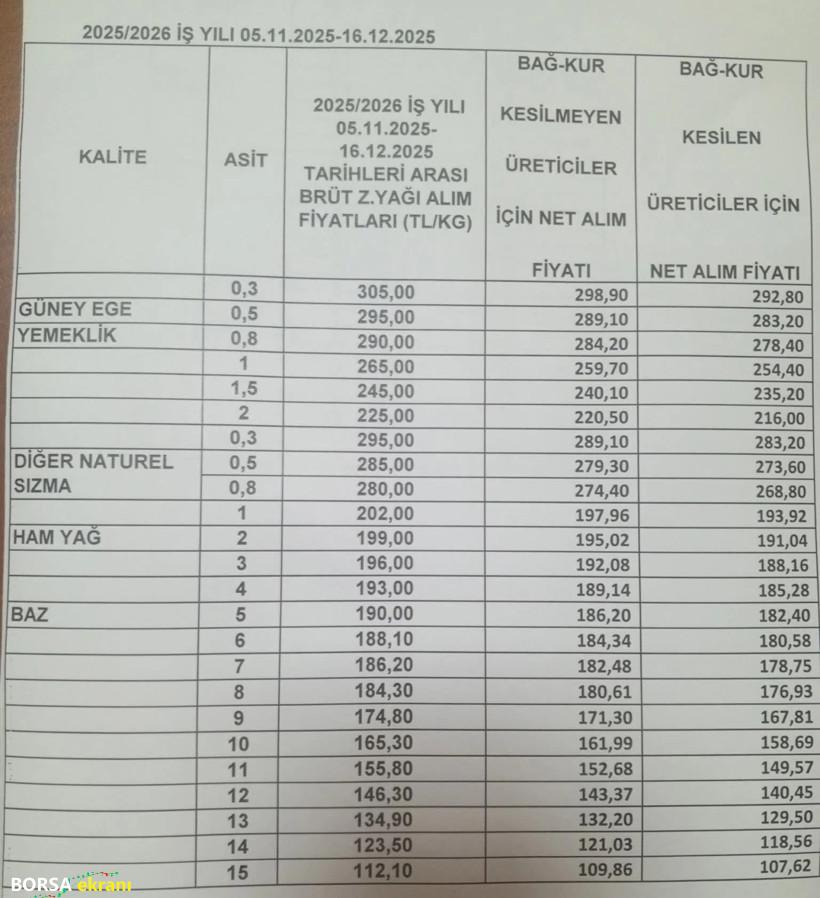 Tariş Zeytin ve Zeytinyağı Birliği tarafından açıklanan zeytinyağı fiyatları ise şöyle: Yemeklik zaytinyağı; -0,3 asit 305 TL, -0,5 asit 295, -0,8 asit 290 TL, -1 asit 265 TL, -1,5 asit 245 TL, -2 asit 225 TL. Naturel sızma zeytinyağı fiyatları; -0,3 asit 295 TL, -0,5 asit 285 TL, -0,8 asit 280 TL, -1 asit ham yağ ise 202 TL.